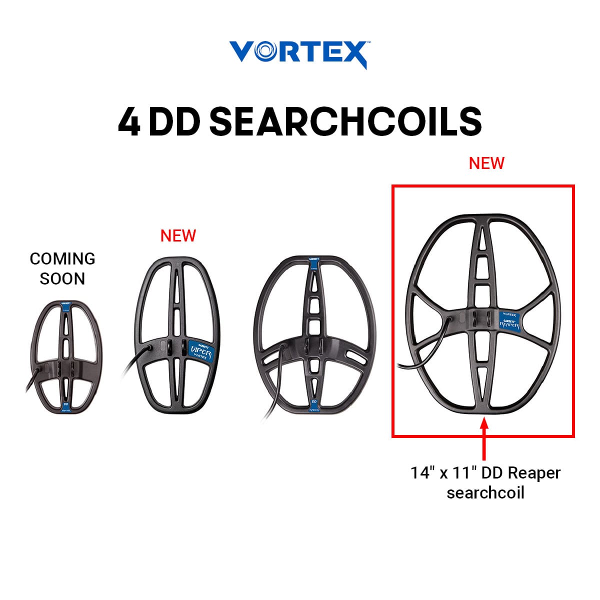 The Vortex 14″ x 11″ DD Reaper searchcoil is a large format accessory coil designed for use with Garrett Vortex series metal detectors. Its large size is perfect for deeper detection depth and for covering more terrain with each sweep of the coil. This highly sensitive coil is durably constructed in a completely waterproof housing and comes with a full 3-year warranty from Garrett.