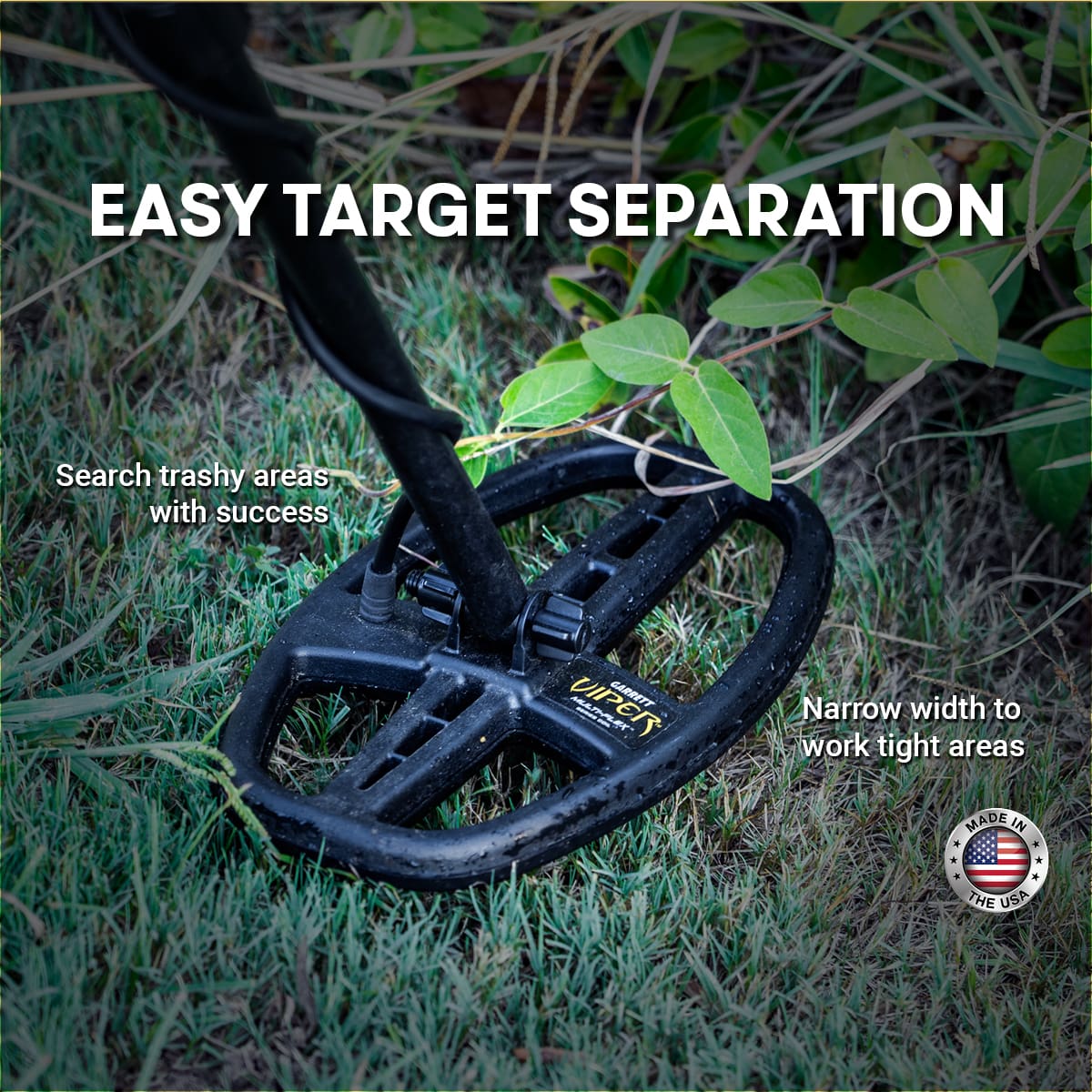 Sensitive Detection Area: The Viper coil is ideal for detecting stubble fields and other tight areas, such as among roots, rocks, or heavily iron-infested areas. With a narrower footprint that standard round coils, the Viper’s energy is highly focused, making it sharp on fine jewelry, coins, and relics.