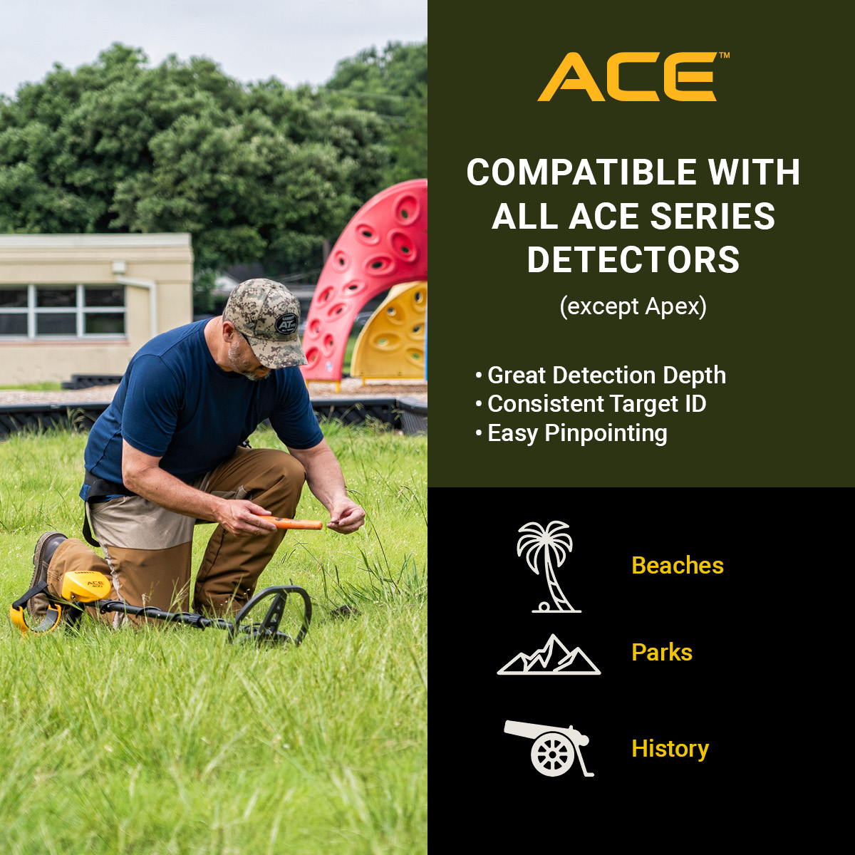 Designed to work with ACE 100, ACE 150, ACE 200, ACE 200i, ACE 250, ACE 300, ACE 300i, ACE 350, EuroACE, ACE 400, and ACE 400i detectors. Protective searchcoil cover is included. Note: This searchcoil is not for use with the ACE Apex metal detector.