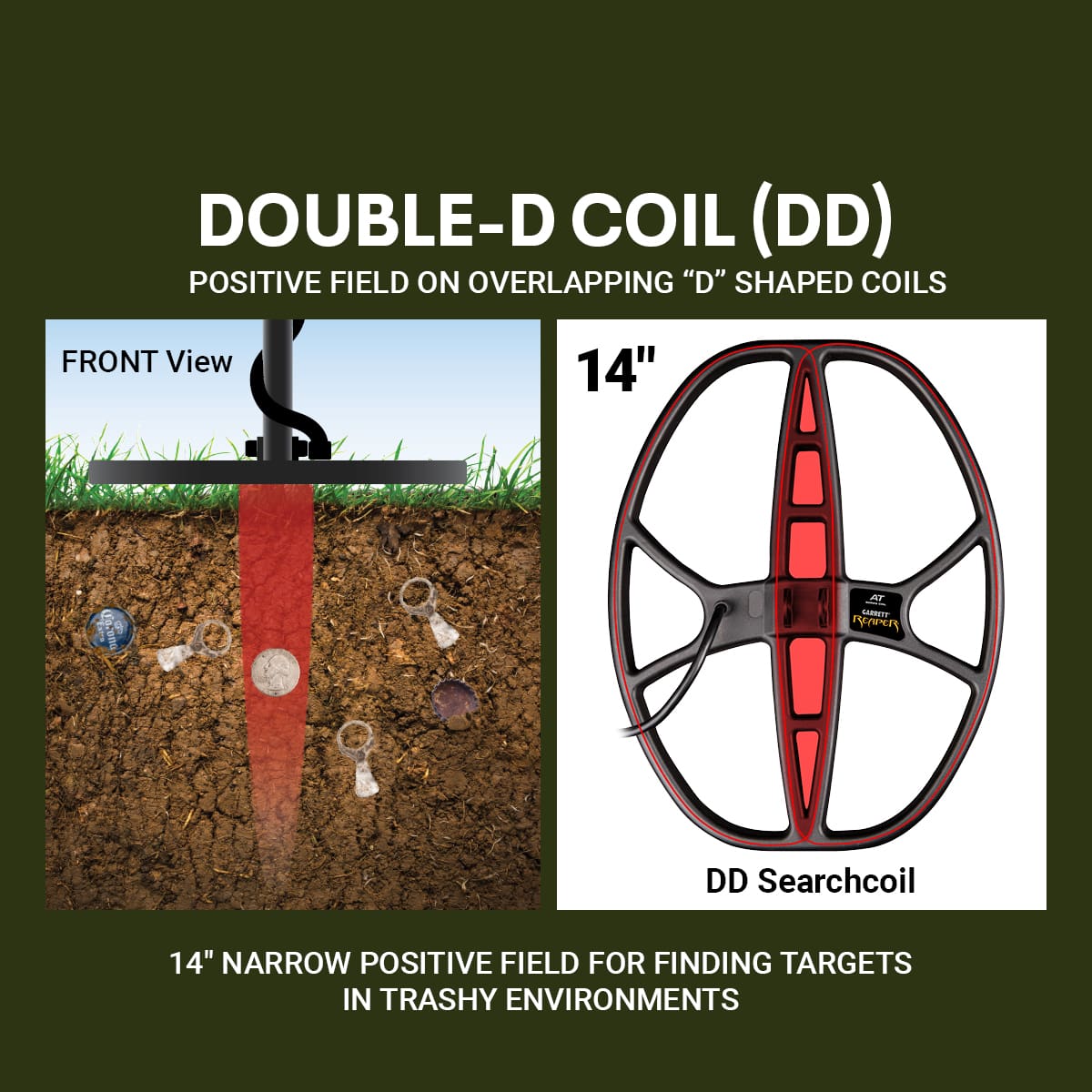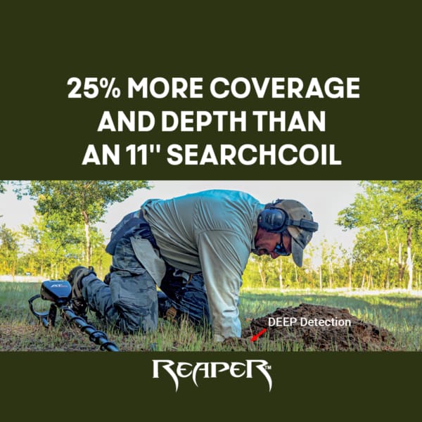 Deep Detection: This 14-inch-size searchcoil provides 25% more ground coverage than an 8.5” x 11” searchcoil. It is perfect for large fields and for hunting deeply buried coin and relic caches.