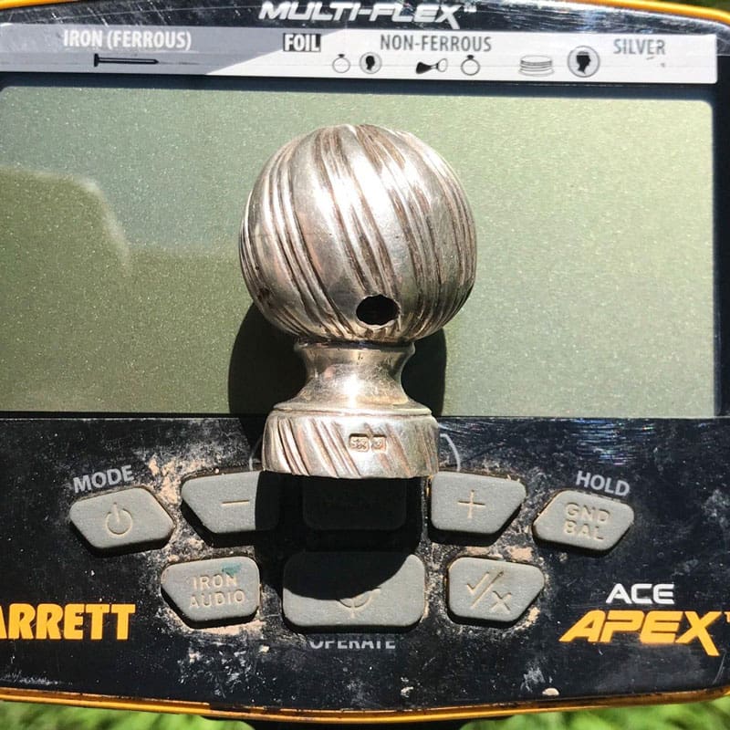 “I was out detecting using my new Garrett Apex at a “hunted out” city park that once was a Civil War training camp. I was digging every signal because you just never know what you can find. While digging every bottle cap, pull tab, and soda can along an old cobblestone road, I got a solid 87 VDI on my Apex. I dug down about 6 inches and what looked like a typical piece of shiny round can slaw turned out to be the biggest/heaviest piece of silver I’ve ever had the pleasure to dig, weighing in at 1.85 ounces of sterling silver.After researching the hallmarks, I learned it was a sterling silver cane topper made between 1830-1865 in London. How it ended up in the woods along the side of an old road in a park is beyond me. I like to think of little scenarios of how it came to rest there for me to find 150+ years later. It’s the amazing and unique historical items I find that drive me to keep rescuing history one hole at a time. Glad to always have my Garrett products to help me save history!”