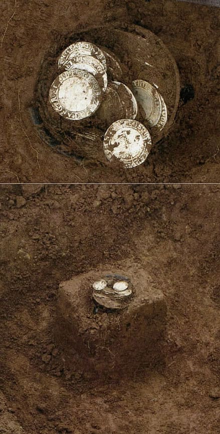 I want to pass along my congratulations to our first winner of my International Favorite Find of the Month. He is Howard M. of Ludlow in England. Howard was using his new Garrett EuroACE metal detector when he discovered a hoard of silver coins that appears to date to the late 1500s or early 1600s. The top of the pot containing the coins was 9.5 inches (24 cm) deep. As seen in the photos, the hoard was carefully excavated by officials of the British Museum, who will evaluate the entire contents of the pot in due time.Congrats to Howard M. for being my first winner and for recovering such a historic cache of English coins!