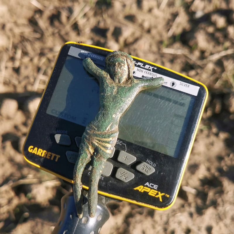 Anthony C. was hunting in a plowed field with his Apex. After hours of digging, he pulled out a Gold Gilded Christ Figurine! He writes, “A cast copper alloy, a gilded figurine of Jesus on the cross from a crucifix of Medieval to Post Medieval date, about AD 1250 – 1600. The figurine is incomplete, with the arms below the elbow and both feet missing. The reverse of the figurine is concave, but the front has been decorated in relief. Furthermore, there was a religious college, now ruined, a couple of fields from where this was found and the museum people believe that this was ripped from a wooden cross during the English Reformation, so approx 1530-40s.”