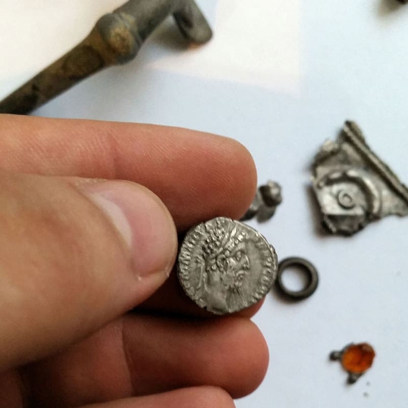 My first international favorite find for July 2015 is the Silver Roman Coin Denarius-Commodus, discovered by Frentescu L. from Romania with his EuroAce.Frentescu’s story: “Let’s go metal detecting I said to a friend of mine and off we went to an area next to my city that didn’t promise much. Just walking up into the heart of the forest, a slight sound disturbed the silence of nature. The earth didn’t let us get too easily a bullet cartridge from WW1 1913. The soil was rock-solid. Afterwards, nonferrous music enchanted my senses. A little sparkle winked at us from approximately 35 cm in the earth. A silver denarius-Commodus in all its greatness! That was the beginning…and after that…pure pieces of history: roman brooches (silver and bronze), roman axe, bronze figurines, pieces of iron from smeltering, small sculpturing tools, bronze ring, pieces of silver, pottery and many more metal objects that filled my heart with joy and 2000 years of untouched history. All objects were given to the local museum.”