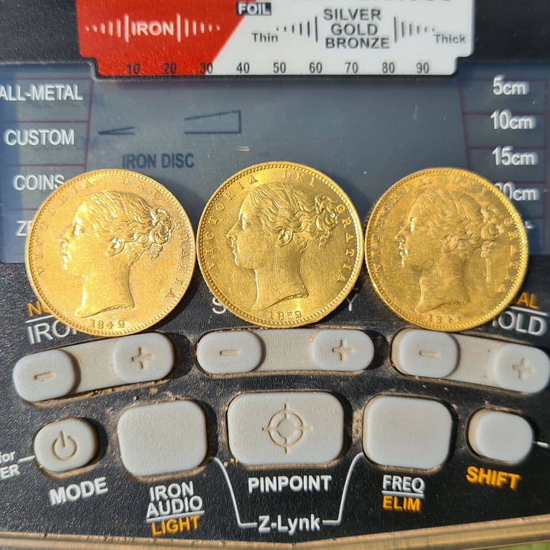 I was teamed up with a friend who decided to walk left and I went right and as you can imagine straight in to the path of the gold. At first all I seen was one coin flick out of the hole and I knew straight away that it was a gold coin! What I did not know was he had friends and to my amazement there was three all up. The coins where 4 inches down and rang up a 66 signal on the AT MAX. The area I found them in was the Victorian goldfields here in Australia. The coins are British Sovereigns dated 1842, 1844, & 1852. Love your machines hope a new one comes out soon.
