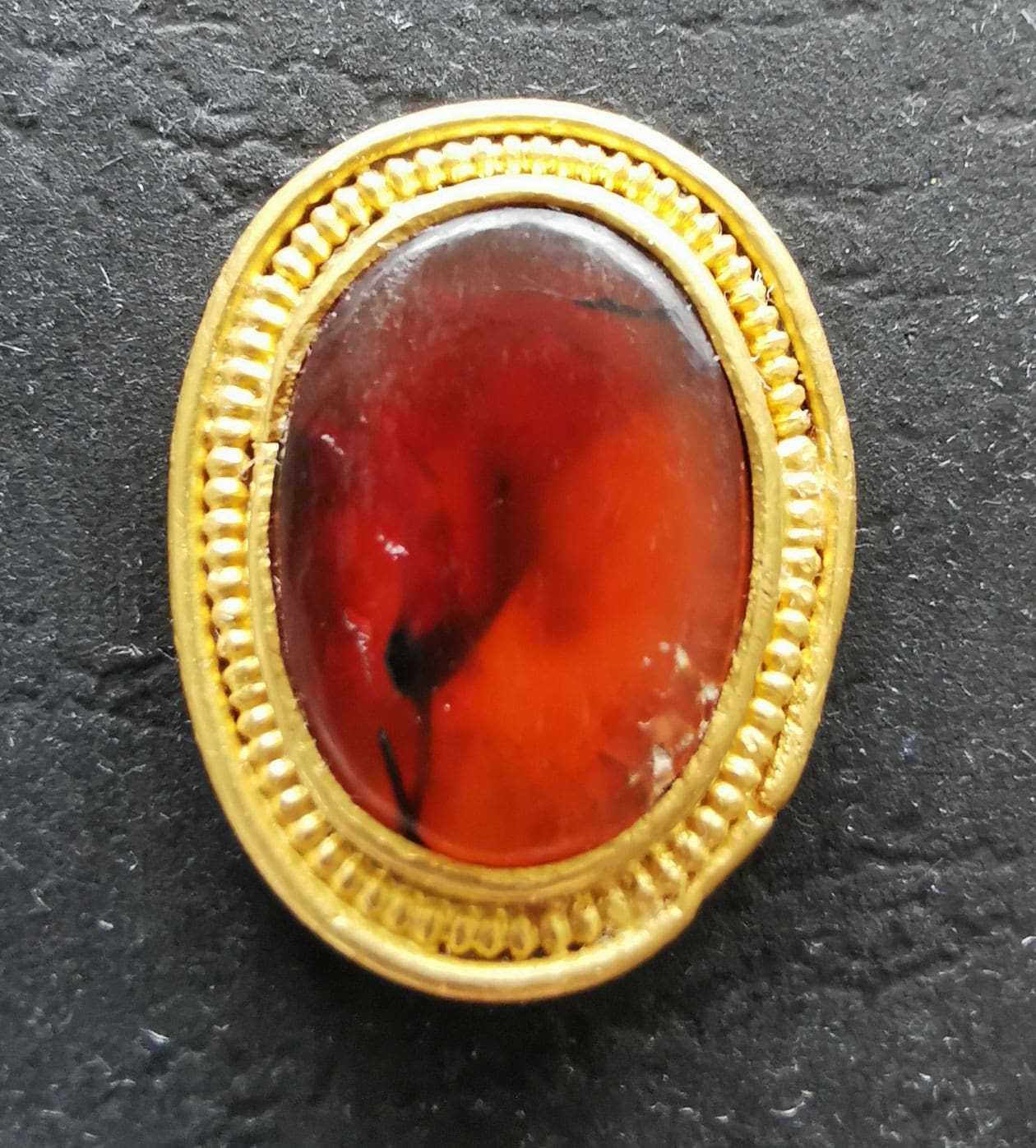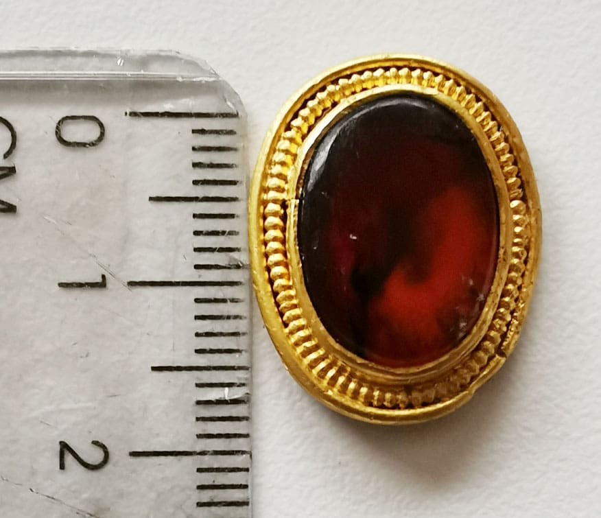 The ring itself is pure gold with amber stone, about 2cm in length. The archeologists in NTNU Trondheim dates it to year 200, age of Rome.