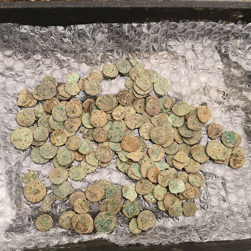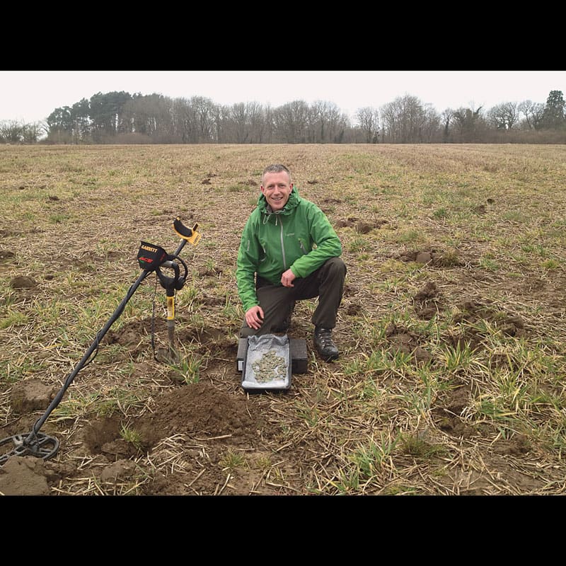 Gary shares the exciting conclusion. “Over the course of the three days I dug just over 200 Roman bronze coins ranging mostly of Radiates and ranging between mid to end of the 2nd century! As these were found on ploughed land, the ploughing over years had disturbed the vessel or bag of some kind holding these coins, which caused it to disperse over a little area of the field. Very happy with the result and so chuffed with my Garrett Euro Ace! The coins are off with my FLO and to the museum. LOL”