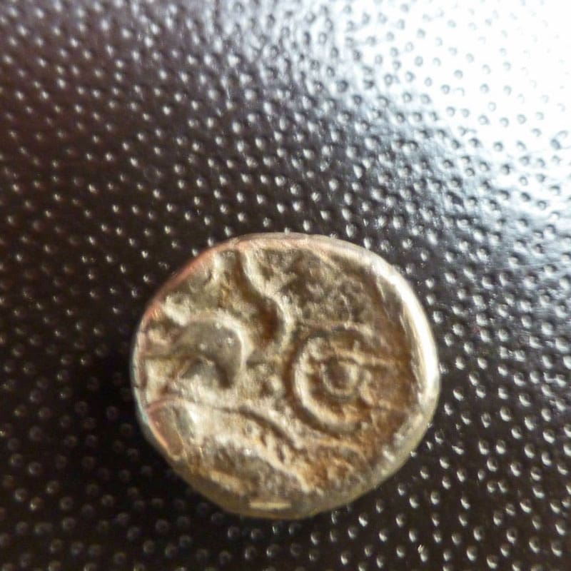 My favorite international find for February 2015 is the Gold Celtic Quarter Stater, discovered by Chris B. from Fareham, England.Chris gives us his story. “I have just started metal detecting, approx. 6 months now, with my trusty Ace 250. I have gained a small permission in Hampshire, England. I have found quite a few old coins and interesting items, but on my last outing I found a very rare Celtic gold quarter stater! Only 13 recorded examples, 14 now he he. The coin dates to 50 BC and comes from a tribe called the Atrebates. They ruled southern England with a king named Commios, who was a friend of Ceasar. Thank you so much for opening me up to England’s wonderful history. Happy Hunting Everyone.”