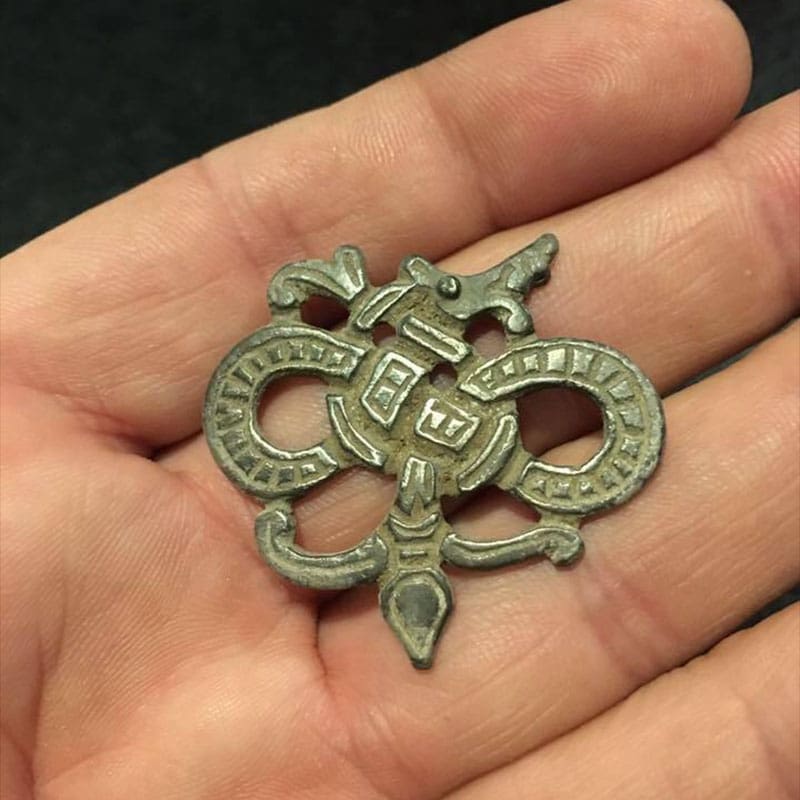 My second international favorite find is the Silver Fibula, Viking 1000 – 1050 AD, found by Ole B. from Denmark with his AT Pro.Ole’s story: “I was hunting a football field from an old school with a friend of mine, he had found a few ww2 nazi coins and some silver rings, I kept finding coins from the 1990’s arghh. So we just talked a bit while walking. I went outside the field, but we have not permission to hunt there, so I just hunted as close without stepping into the trees. When I hit the target, the sound was clear as crystal and the item was only 15cm down. I picked it up, but was a bit unclear what it was, I could see it was silver as it was black, but did not know what I had there, I put in a small plastic box and hunted some more. At night I put it in a detector group on FB and there was fast 50 comments and 250 likes. The next morning I had a message on my cellphone from a guy in the local museum, he was also pretty excited over this piece, its very rare to find this in silver, normally they are in bronze. It’s a urnes fibula from the Viking age, around 1000 – 1050.”