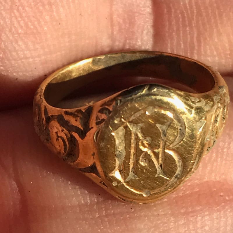 As I was leaving, I showed Nancy my finds and the moment that ring came out, she begin tearing up. I handed it to her, and her hands were trembling. She was telling me how she remembered losing that ring in 1951, the year she graduated, 67 years ago! She told me she was with some friends at her house in the evening and during dancing it flung off. She said that her dad had looked for it in the yard for years with no luck. She brought out her old ID where it shared the same initials.