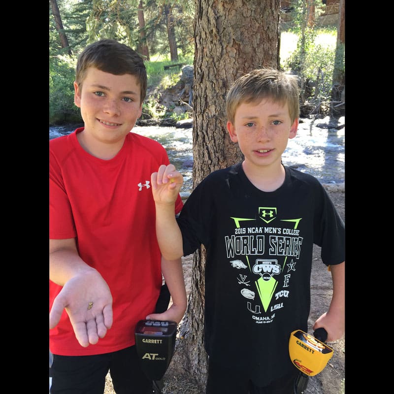 August 2015 WINNER! My U.S. Favorite Finds for August 2015 are the Three Small Gold Nuggets found by Wes and Nick S. with their AT Gold and Ace 250 detectors.Wes and Nick’s father, Michael S., submitted the story. “On vacation last week in Colorado my boys struck gold. I recently bought your Garrett AT Gold a couple of months ago for our trip. We were nugget shooting north of Jamestown, CO. Wes found 2 small gold nuggets using the AT Gold weighing 1.9g total weight. That machine work awesome, love the iron audio and the ground balance display. Most of the time the ground balance read between 74-90. Nick found a nice 1.8g dime-sized flat gold nugget 4 inches in the ground using the ACE 250. With the soil being as hot as it was, the ACE 250 worked great. I was not expecting that, it ran very quiet and did not false much at all. Even after I turned the sensitivity way up it hardly had any falsing. Thanks, MS.”