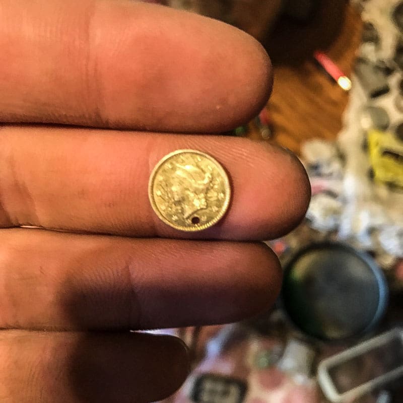 I then got a 51 signal on my AT Pro and said hey son I think I got a nickel here at 4 inches. I took my ATX shovel and dug down by the sidewalk of this 1840’s home and said oh my God. He came a running. I looked down at another gold thing. Pulled it out and we was both in awe. An 1851 liberty head gold $1 coin. We hunted for another hour. Took our finds in and showed the owner. Very exciting day and another memory made with my son.