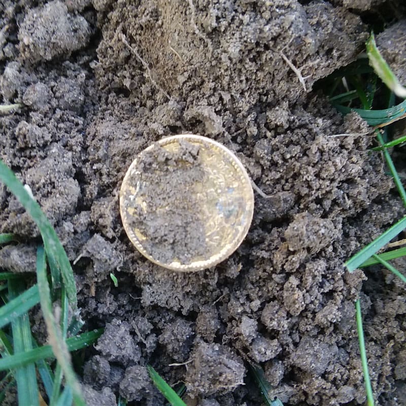 My friend Billy and I were planning to do some island hopping on old homesteads, when he decided that we should go down and check out a field before we left. Approximately 5 minutes into the field search, Billy struck across a 1843 large cent. 15 minutes after that is when I ran my Max across what I believe to be now, the best signal I’ll probably ever get in my lifetime, screaming an 84 at 4″ deep. I proceeded to cut my plug, and the pin-pointer could pick it up.