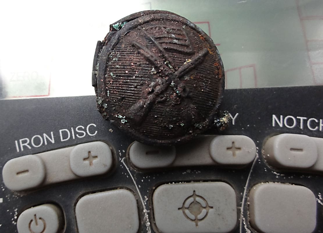 My second U.S. favorite find is the Civil War Sweetheart locket, found by Joe E. from Florida with his AT Pro.Joe’s story: “I was hunting a construction site in a very old part of Pensacola dating back to 1559. Working a dug up area, I swung my AT Pro over a dirt pile when I got a slamming signal. Out of that bulldozed dirt pile came this awesome Civil War sweet heart locket. Eagle button on one side, and two crossed muskets with a 13 star flag on the other.”