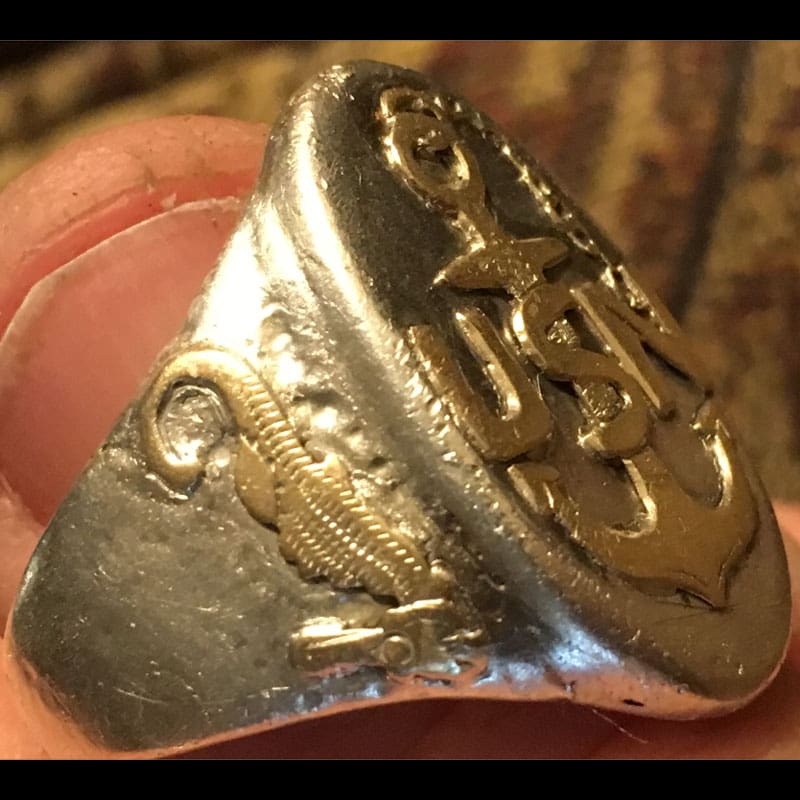 There weren’t any maker’s marks inside the ring for identification purposes but I carried it around with me for a few weeks. I was showing the ring to folks seeing if anyone could help me figure out the ring’s history. I eventually showed it to a fellow employee who was also retired from the Navy. He identified it right away that it was a Chief Petty officer’s ring due to the gold fouled anchor and chain on the face of the ring. He stated when an officer reaches the rank of Chief Petty, his men will make him a homemade ring to celebrate the event. Doing a bit of additional searching, the gold seahorses on both sides of the ring also mean he reached the rank of Master Diver. While not official, he figured it was WWI-WWII time period. Would be nice to know the complete history of the ring but to me it was a pretty special find on a very hot summer afternoon!!!