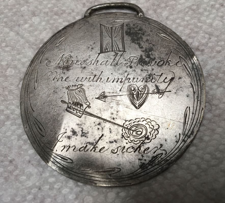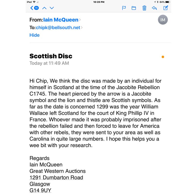 The disc inscriptions: (obverse) Touch and I Pierce, Aug 23, 1299, W.W., and (reverse) None shall Provoke me with impunity, I make sicker. It is a flat thin silver disc covered with Scottish iconic engravings. There is a lion, thistle, heather, hourglass, a heart pierced by an arrow (means a Jacobite) and a hand wielding a sword stabbing a rose (means Striking at England which is often represented by a rose. This item actually looks like a metal detector.)