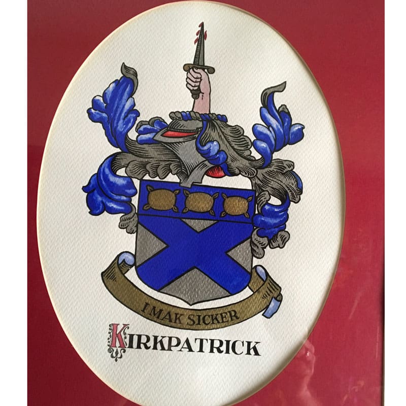 I recognized the slogan “I MAKE SICKER (Siccar)” means I MAKE SURE. In 1306 Robert the Bruce was chasing the Scottish crown but he had a strong opponent John “Red” Comyn who was the favorite of most of the nobility. Bruce suggested they have a meeting in the church in Dumfries. Churches were considered safe sanctuary but during the meeting, Bruce pulled his dagger and stabbed Cornyn and fled. Outside was his best friend and third cousin, Sir Roger (Roget) Kirkpatrick. When told what happened Kirkpatrick asked if Comyn was dead and Bruce admitted he did not know. Kirkpatrick pulled HIS dagger and said the now famous phrase and went inside and finished Comyn which allowed Bruce to take the throne. This is all well documented. There is also the line TOUCH AND I PEARCE. (Pierce ie stab). This was the original Kirkpatrick Family motto before the Comyn incident.