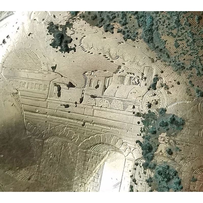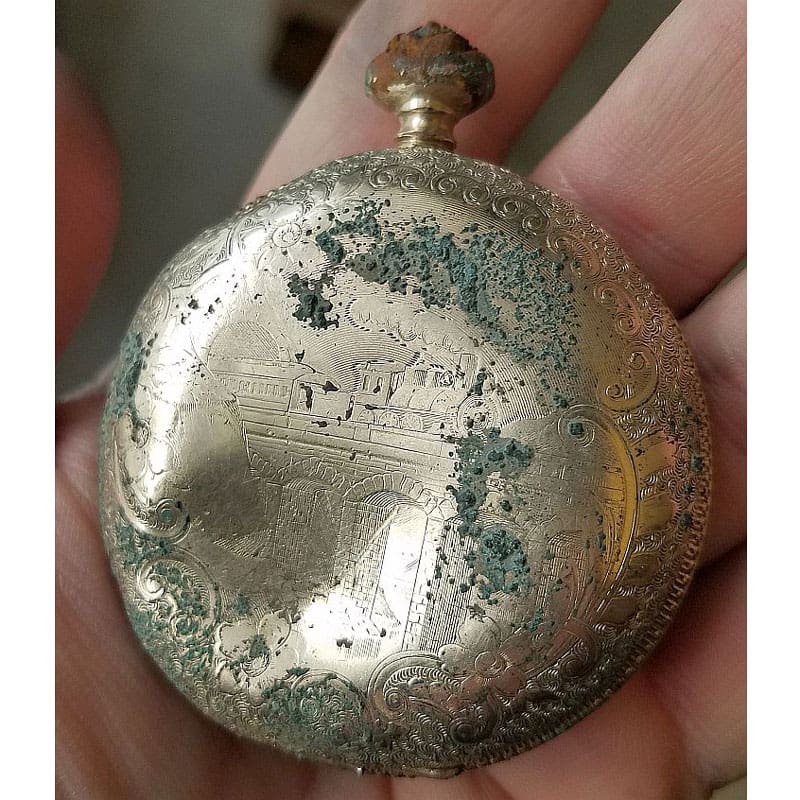 My third U.S. favorite find for February 2018 is the Heavily Engraved Railroad Pocket Watch, found by Justin H. from Indian with his AT Pro.Justin’s story: This is one of my all time favorite finds and was a great way to start 2018! I bought a new, larger coil for my AT Pro and decided to test it out at a buddy’s 1820s home that I’ve hunted a few times before. We’ve never found anything real great there, but I figured it would be a good test for the new coil. I got a faint, but repeatable signal that was reading 8″ deep. After digging a deep plug, I unearthed a very large and muddy pocket watch. My gloves were too caked in mud to see any details, so I put it in my pouch to clean off later. After getting it home, I took it to the sink to wash it off. The water revealed that this pocket watch was VERY heavily engraved! Even better is that it’s engraved with a very ornate train scene on both sides! It appears to be gold plated, but it could be a low karat gold (10k?). I researched the property a bit and found that the large “ditch” nearby is actually an old railroad track that once ran through the area. It was in use from the late 1850s until the 1950s. It’s interesting to think that this watch might have belonged to someone who worked for the railroad that ran through their property. It now sits as a centerpiece in my collection!