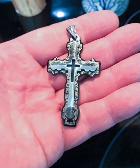 The cross has no markings on it and it’s heavy, very pretty, and I found it about 6” deep.