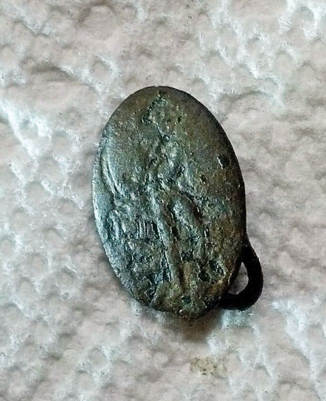 My third favorite U.S. find for July 2015 is the George Washington Inaugural Cuff Button, discovered by Chris R. from New Hampshire with his AT Pro.Chriss story: “It was very hot and humid but I had a “feeling” that I might be missing out on something special. I normally use the smaller coil but today decided to use the standard coil. I went to a old abandoned road that has 5 house sites. This one just looks like a pile of stones. After 15 minutes, I had a faint hit with a mid-to-high repeatable signal by the edge of a 7 ft boulder. So I start to dig. 10 inches down I get this small cuff button with the link still attached. I think “neat”, throw it in my pouch and keep going. I dug up 3 more buttons before the heat got me. I get home and start to look at it. It looked like it might have a tree branch on it but it was dirty. I soaked it in mineral oil for a couple of hours then took it out. Using a toothpick, I scraped away at the dirt and could now see a profile. I thought I saw something like this before on a George Washington inaugural buttons site. Sure enough, it was an inaugural cuff button! Only 3-5 known specimens EXIST. Ultra rare! I couldn’t believe it. I was so excited, I dropped it in the sink, and had to take out a part to get it. My AT Pro comes through again, big time! Thank you Garrett for this “once in a lifetime find.”