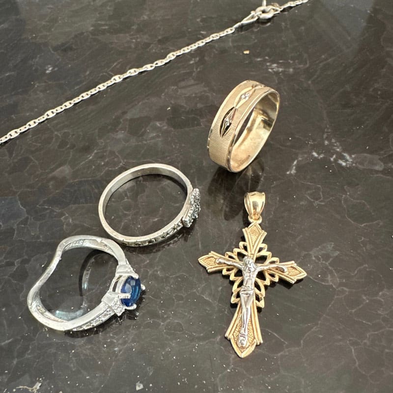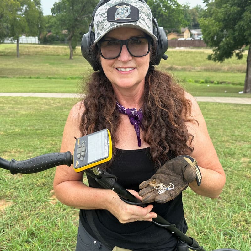 Congratulations to our US Favorite Finds winner Jaki B. from Texas!Jaki B. was detecting in a city park when she got a solid signal in the 70s on her Apex. She discovered her first ring, a 10K gold wedding band, 2 silver rings, a 14K gold crucifix pendant, and a stunning 26-inch silver 925 chain all in the same hole! She said, “What a day! Thanks to my trusty Garrett Apex and a stroke of luck, this is a day I’ll cherish forever!”