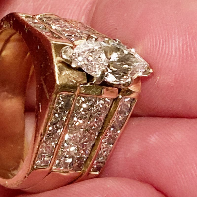 It has 40 Princess cut inlay diamonds and the center is a Marquis. My only clue of its value so far is the jeweler said he couldn’t find any “inclusions” in the Marquis. The stone setter said “I’m not a gemologist or appraiser but I think it’s worth $15,000.00 – $20,000.00!!!!”. Can’t wait to see the appraisal!