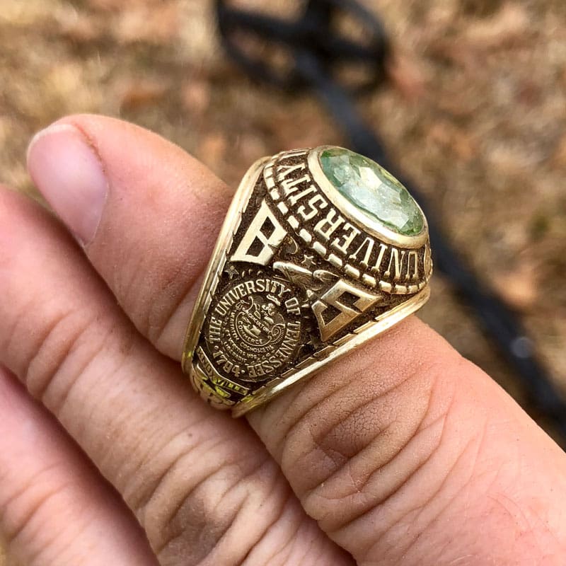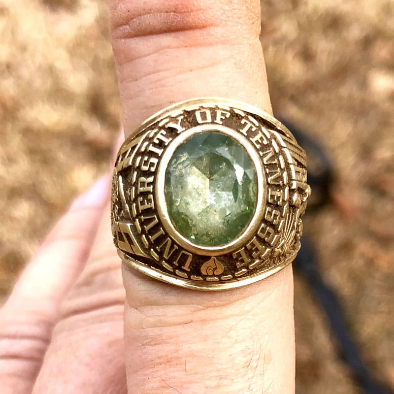 I was detecting a subdivision that had been torn down. I came across a nice solid signal and was shocked to dig up a HUGE gold class of 1970 University of Tennessee class ring about 4-5 inches deep. As my husband was calculating the price of gold, I was already composing an email to the University of Tennessee Alumni Association to help me find the owner. After a few emails back and forth, the ring owner was identified as a local surgeon, Stephan S. Coincidentally, he had actually done surgery on my arm about 25 years earlier! I excitedly contacted him and made arrangements to re-unite him with his long lost ring. A reward was offered, and quickly turned down… returning the ring to its rightful owner was a far greater reward than any amount of money!