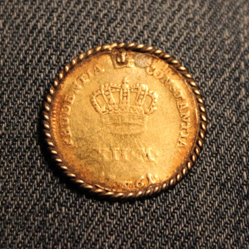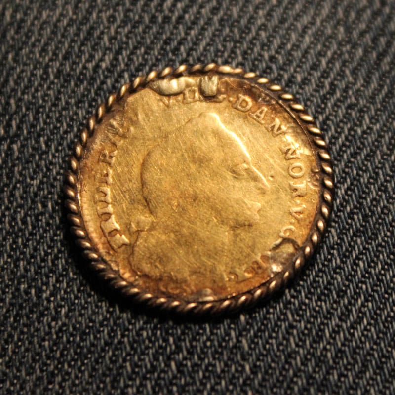 So I grabbed my trusty trowel and started digging a plug. After I popped the plug out I saw something really shiny. To myself I said, oh great, another gold colored pop tab. But as soon as I brought it closer to my face its shape rounded out and I saw a man’s head. I very carefully brushed some dirt away. My heart started pounding. I truly couldn’t believe it. After racing home I further inspected the coin. It was a 12 Mark gold piece from Denmark. The date, 1761, still legible. It is far from being in good shape, and someone soldered a frame around it, but to me it is my first great discovery, the true diamond in the rough.