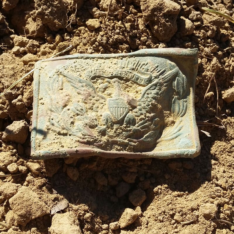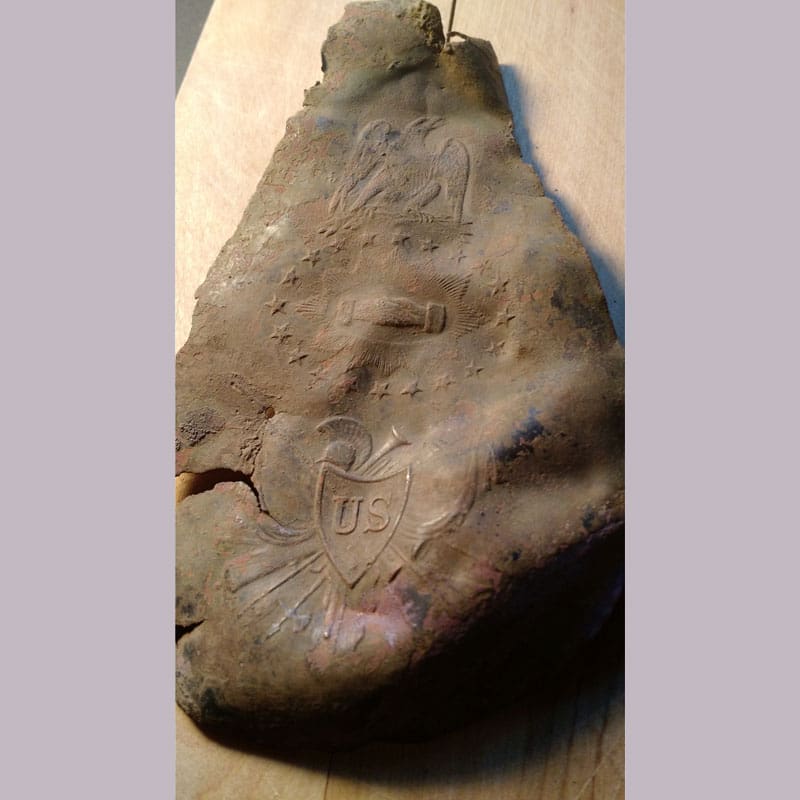 My fifth U.S. favorite find for November 2016 is the Civil War black powder flask, found by Ritchie K. from Maine with the AT Pro.Ritchie’s story: My friend Kelly and I hunted a house site that is now just pasture. When I dug the flask it was covered with dirt and I thought it was sheet metal flashing (trash). It wasn’t until the next day that I could see what looked like a shield stamped into it. Gently I dry brushed the dirt away and the detail emerged.
