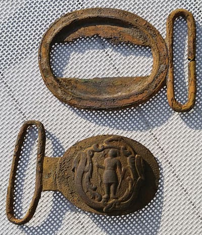 My second favorite U.S. find is the Massachusetts Militia Officer Sword Buckle Plate, found by Patrick L. from Massachusetts with his AT Pro.Patrick discovers a rare find. (edited) “I bought my first entry level detector in September 2014. By January 2015 I was addicted to the hobby and bought my beloved AT Pro. Finding this buckle was the result of 30% research, 20% intuition and 50% luck. Last winter I researched locations trying to hit a promising virgin or lightly detected spot. One of them was by a riverbank, so in late August I loaded the kayak and went on my first river hunt. I searched the shallows and the water’s edge. Was lucky enough to put my coil on the right spot. Gave me a mid to high 70 at 8” deep. Now, being still relatively new to the hobby I learned a lesson that day: Come prepared with the right tools, and if you start a dig, go all the way. It was under a bunch of river bushes and roots and I had nothing but my hands and a small shovel to cut them. Painful. Took me a while. The only reason I kept going was the sound in my headset: Nice and crisp. Finally got it in my hands. I knew immediately it was a buckle and I recognized the state of Mass emblem but did not realize what I was looking at. Just though “Nice!” and put it away. A few minutes later about 5′ away I found what I believe to be the top of a lantern. When I got back home I could not find much information about the buckle, so I posted a picture on Treasurenet.com and quickly realized that I had found an extremely rare and unique item: a State of Massachusetts militia officer sword buckle plate.”