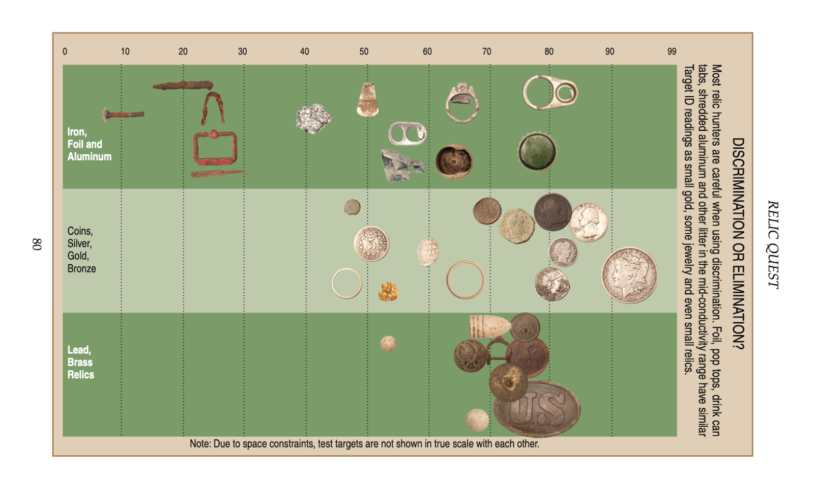 In the image above, this chart breaks down the range in which a Garrett metal detector can detect certain metals. For most Garrett detectors, they pick up ferrous targets within the 0-40 range. This may not be true for other brands of detectors, but it’s an important resource for visualizing the detector’s capabilities.