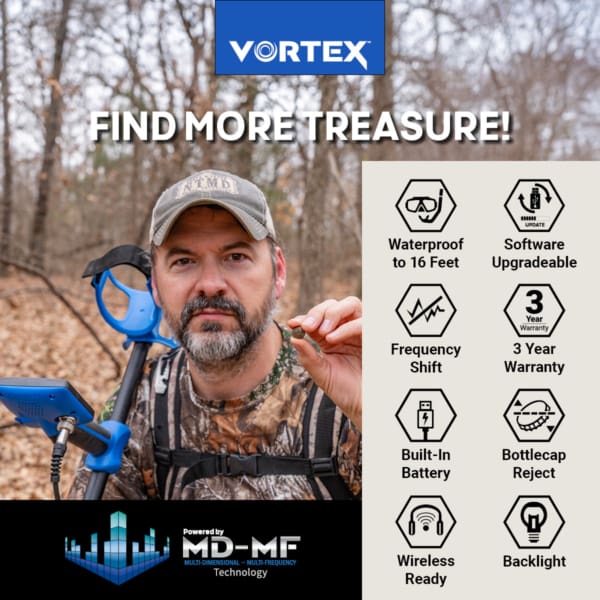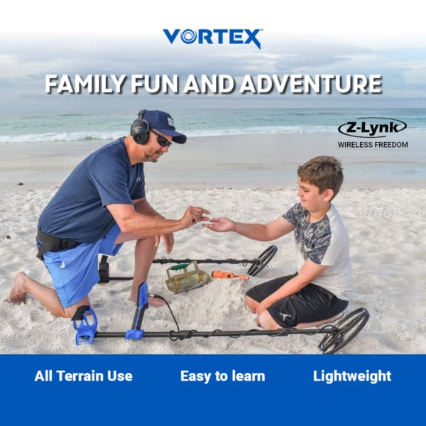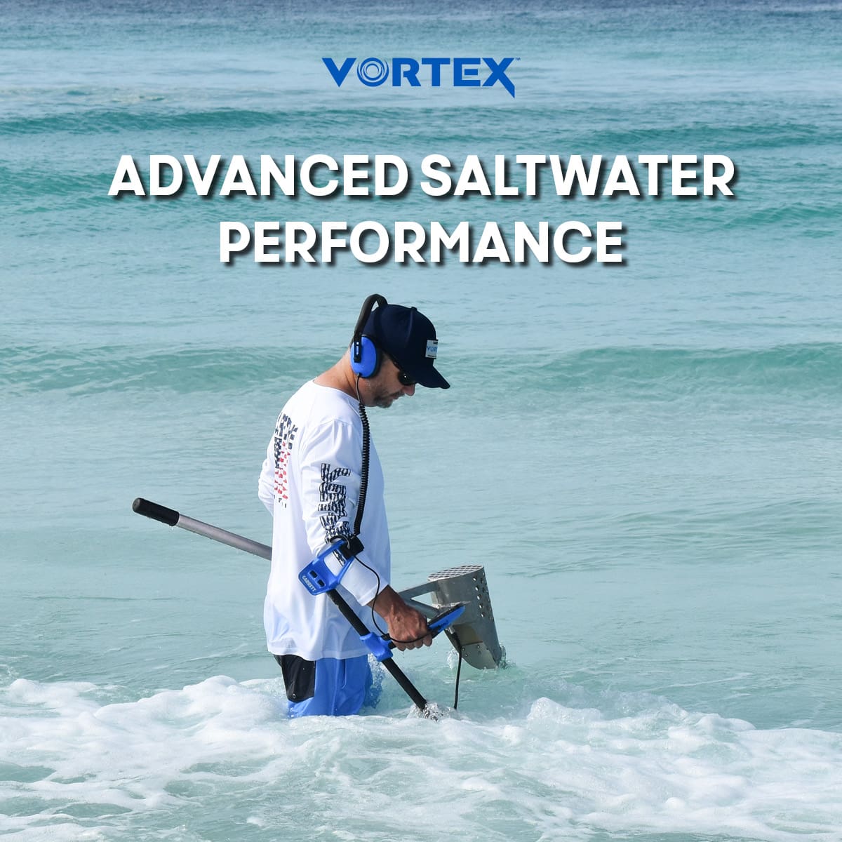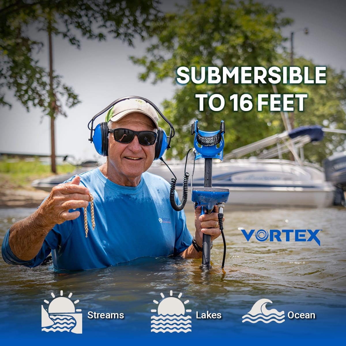 The intermediate Vortex model. Offers 2-tiered MD-MF Target ID display, Multi-Salt multi-frequency for saltwater hunting, increased power, built-in wireless operation, and five search modes. Submersible to 16 feet (5 meters).
