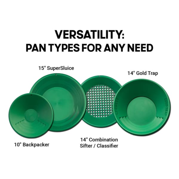 - Includes 14″ Gold Trap pan, 15″ SuperSluice pan, 14″ Sifter/Classifier, and 10″ Backpacker pan