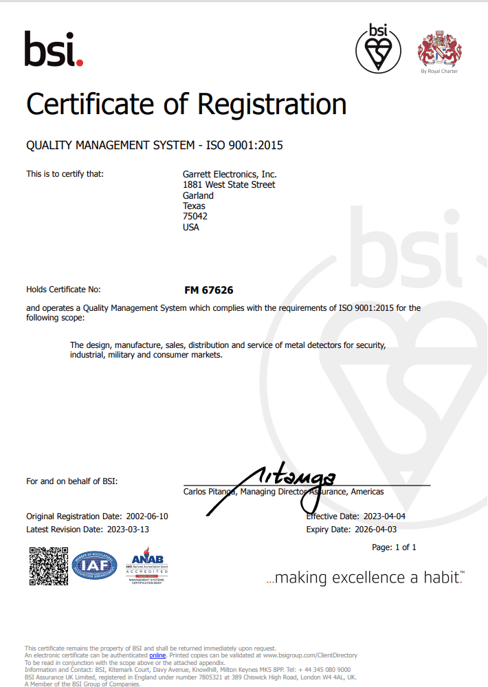 Garrett Metal Detectors has achieved certification as an ISO 9001 company. This certification means that Garrett has met stringent guidelines with regard to product design processes, manufacturing procedures, distribution systems and customer service methods for all products and services that Garrett provides.