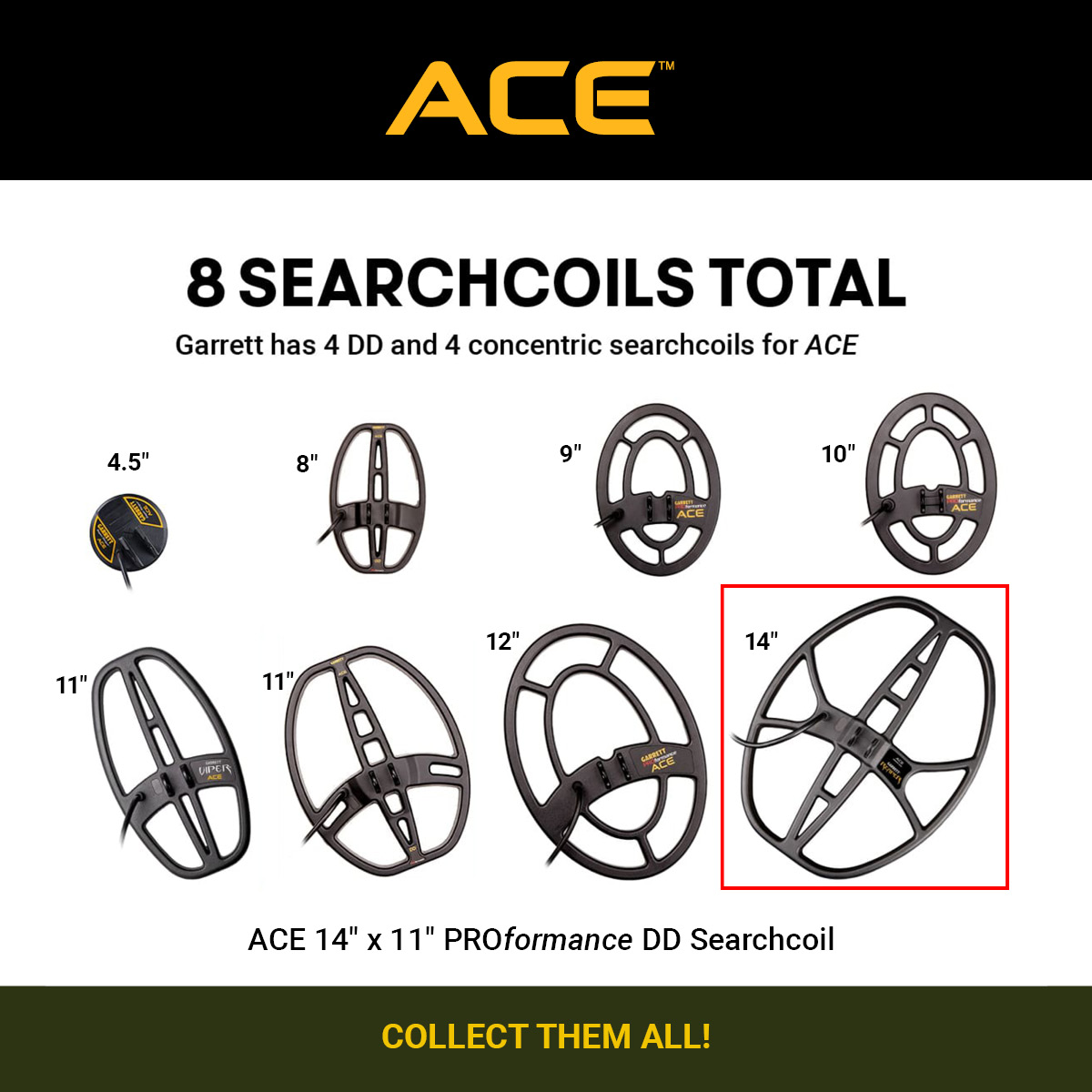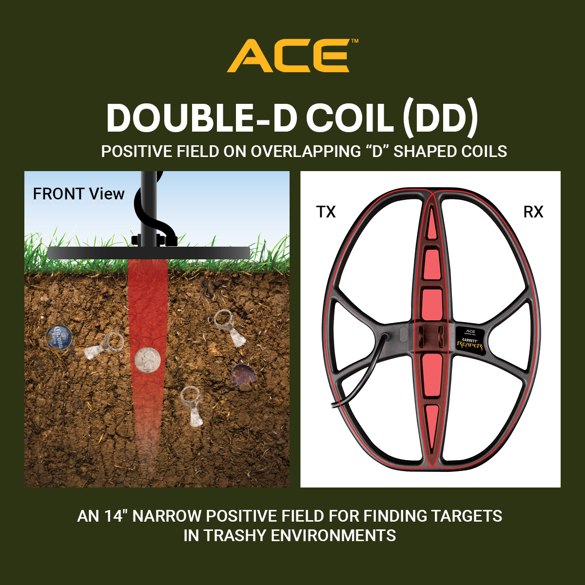 Garrett представляет свою новую поисковую катушку 14”x 11” DD Reaper для металлоискателей серии AT, ACE и Apex. Эта катушка обеспечивает увеличение захвата на 25 % по сравнению с катушками Garrett 8,5”x 11” DD Raider. Большие катушки сторонних производителей не работают так эффективно. Reaper обеспечивает значительное увеличение глубины обнаружения целей среднего и большого размера, сохраняя при этом превосходное обнаружение небольших целей.