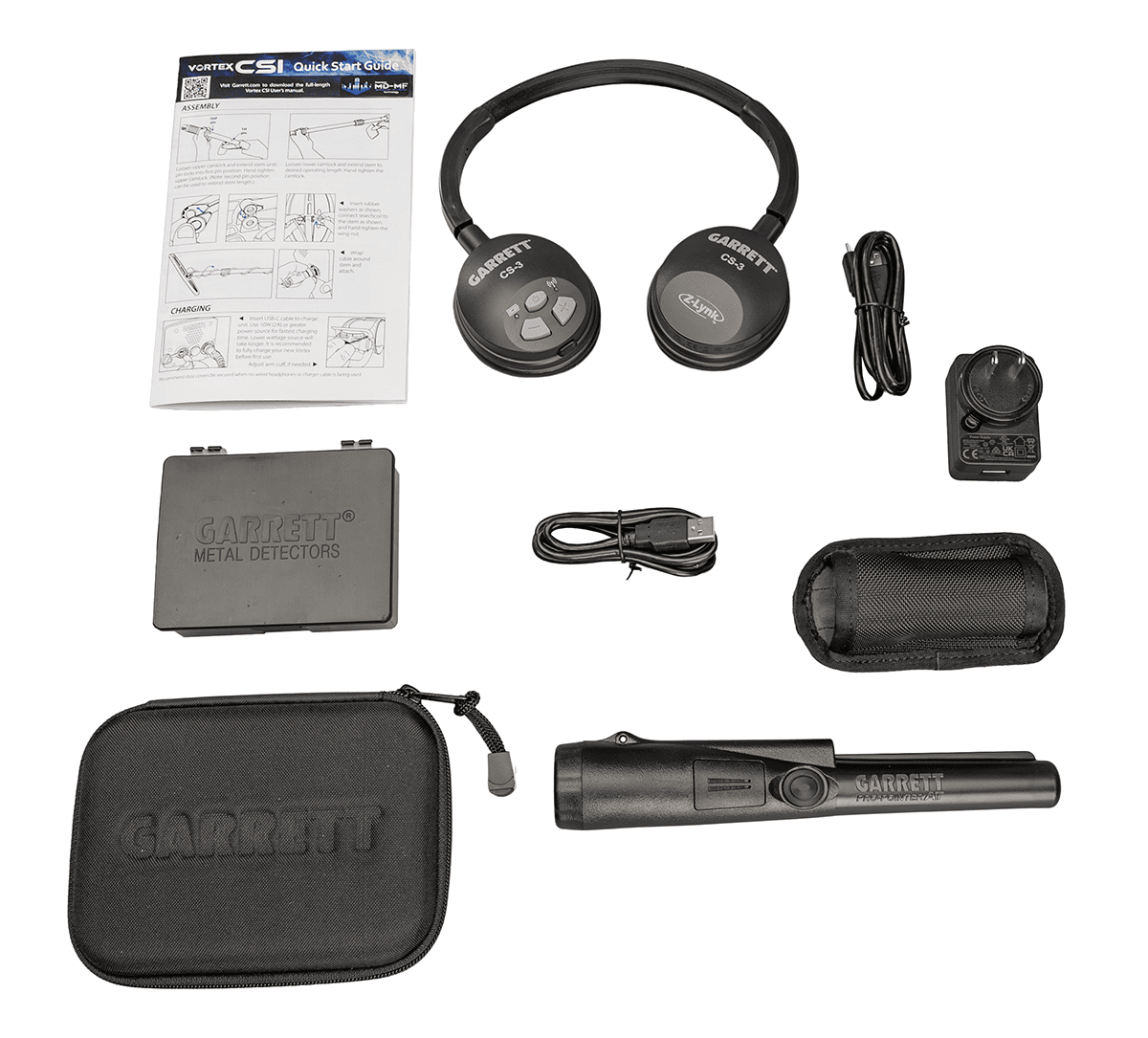 Includes: Vortex CSI detector, Garrett CS3 wireless headphones, a Garrett Blackline CSI Pro-Pointer AT pinpointer, a test target box, charger block and cable, and more.
