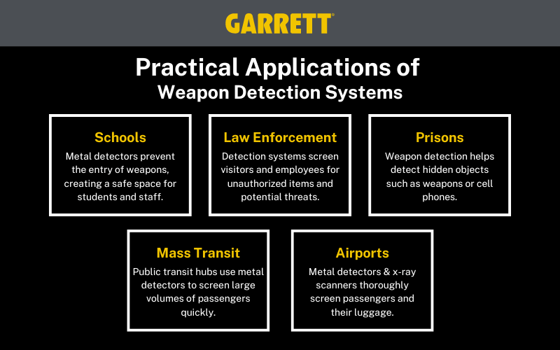 - The other approach focuses on the detection of smaller, easily concealed weapons that present risks in more controlled environments like schools and airports. This method exchanges speed of thoroughness, ensuring even the smallest threats are identified. Some weapon detection systems struggle to identify these smaller targets, but Garrett’s equipment is adept at finding both large and small weapons, with settings to accommodate either scenario.