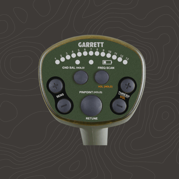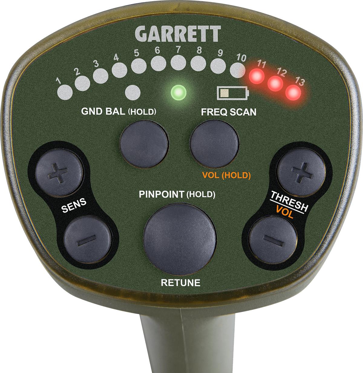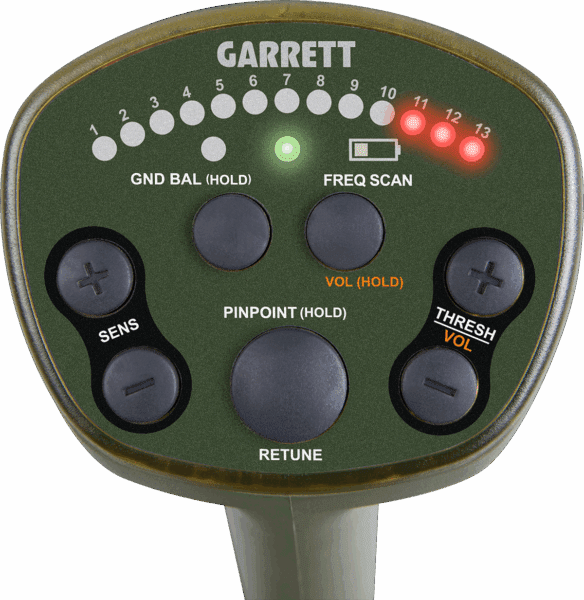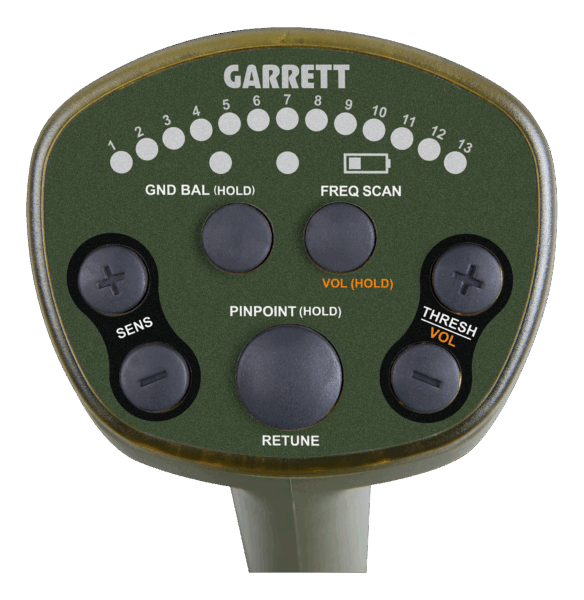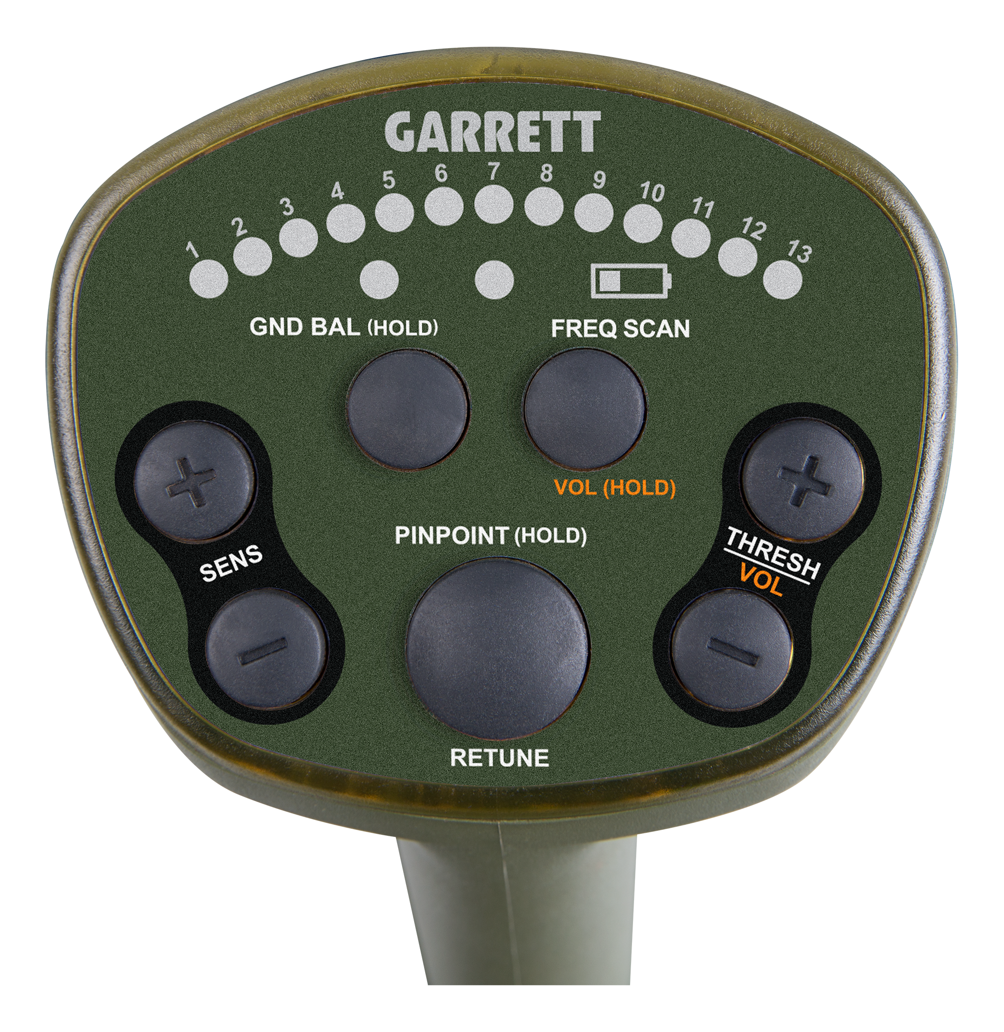 Single push-button controls for Sensitivity, Adjustable Audio Threshold, Volume, and Ground Balance can be adjusted with one hand.