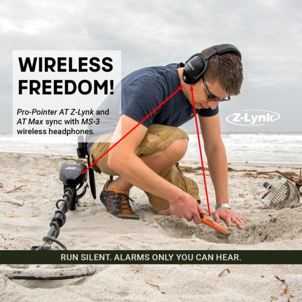 Sync your PRO-Pointer AT to your Z-Lynk-enabled detector. Hear both detector and pinpointer alarms in your headphones. Submersible to 20 feet.